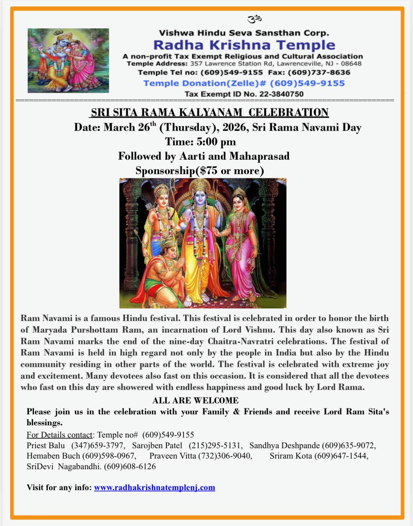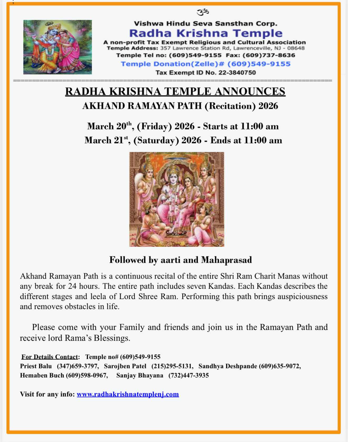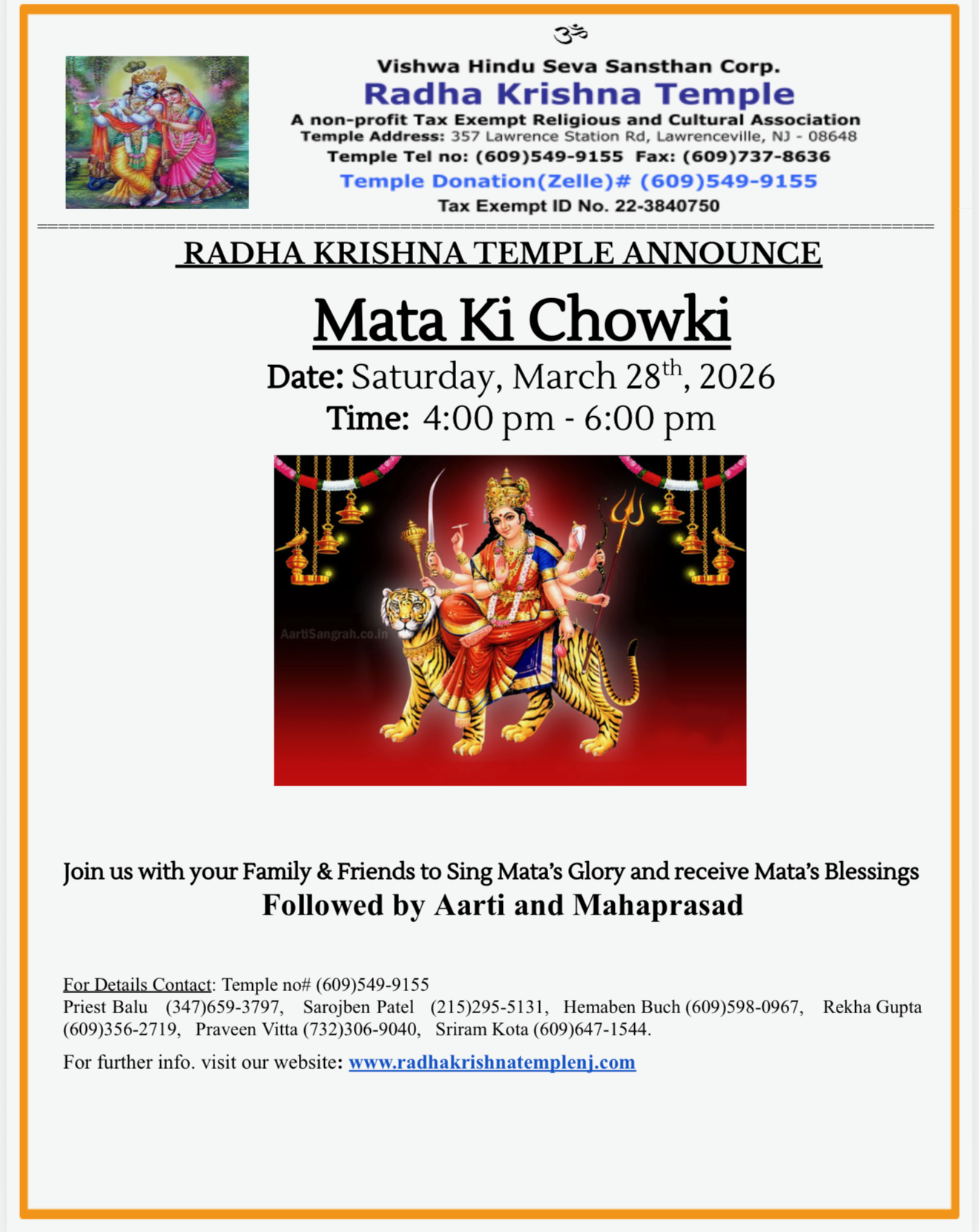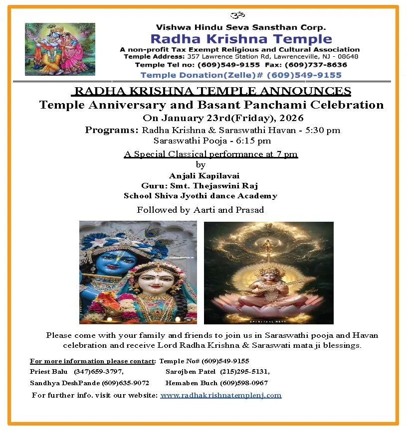 Located in Lawrenceville, NJ, our temple welcomes all for prayers and festival celebrations. Come to enrich your and your childrens’ lives through our Vedic culture and heritage.